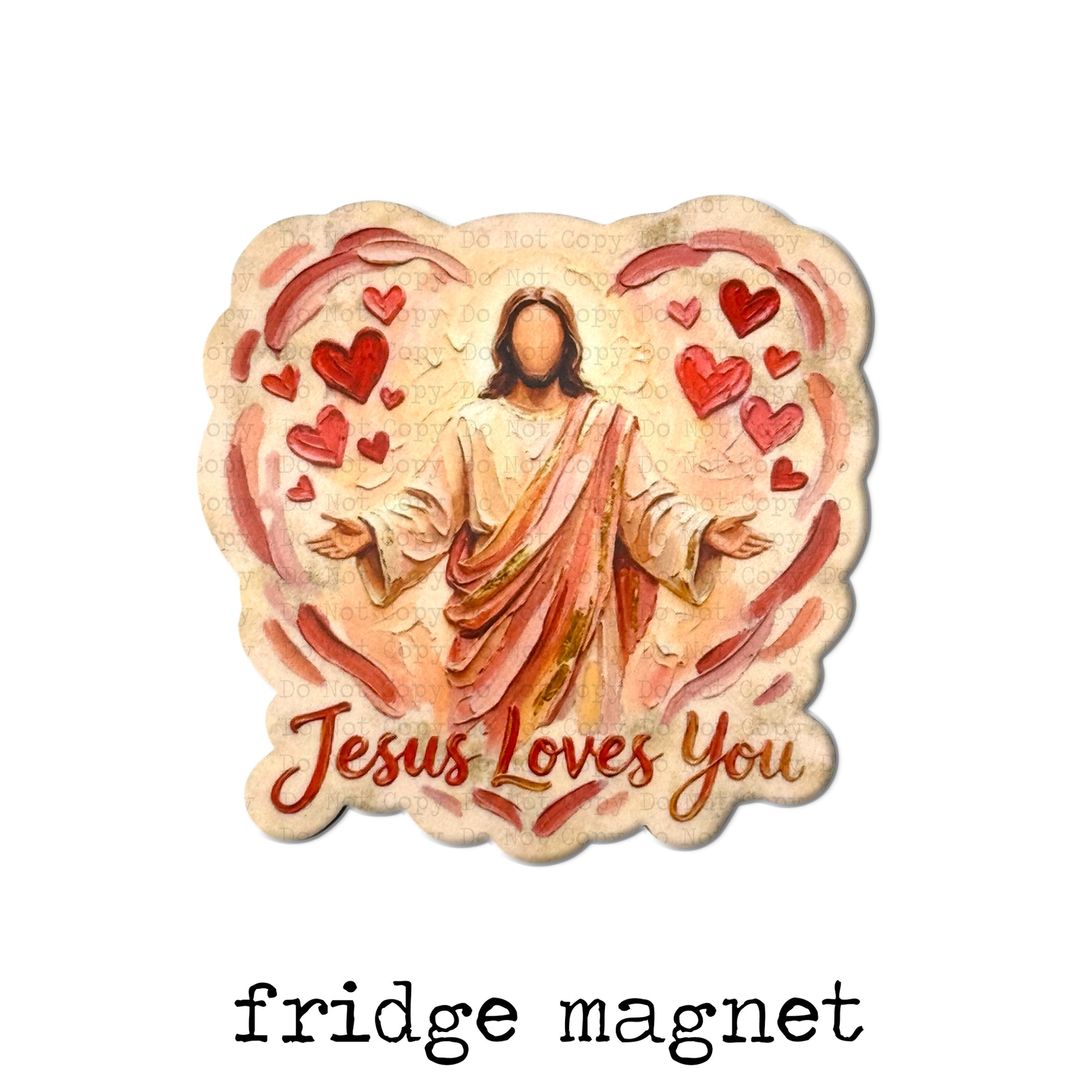 Bring a daily reminder of divine love into your home with this beautiful "Jesus Loves You" magnet. Featuring an inspirational illustration of Jesus surrounded by a swirl of vibrant red hearts, this piece is a meaningful addition to any magnetic surface.